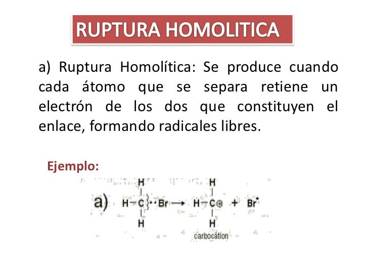 Rompimiento Heterolitico : En química se denomina heterólisis o ruptura heterolítica a la ruptura de un enlace químico de una molécula neutral que genera un catión y un anión. En este proceso, los dos electrones que constituyen el enlace son asignados al mismo fragmento.